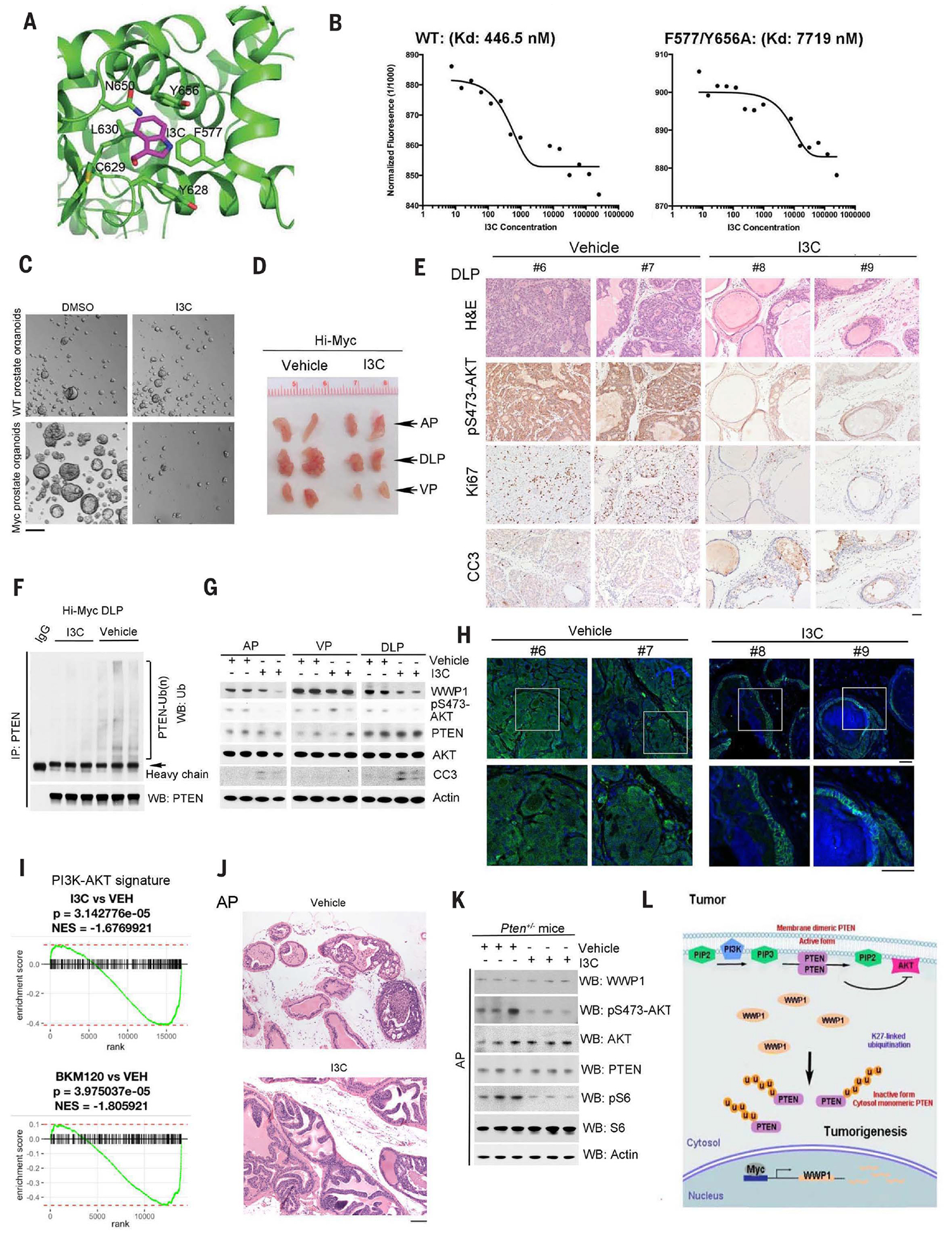 Activation of tumor suppressors for the treatment of human cancer has been a long sought, yet elusive, strategy. PTEN is a critical tumor suppressive phosphatase that is active in its dimer configuration at the plasma membrane. Polyubiquitination by the ubiquitin E3 ligase WWP1 (WW domain–containing ubiquitin E3 ligase 1) suppressed the dimerization, membrane recruitment, and function of PTEN. Either genetic ablation or pharmacological inhibition of WWP1 triggered PTEN reactivation and unleashed tumor suppressive activity. WWP1 appears to be a direct MYC (MYC proto-oncogene) target gene and was critical for MYC-driven tumorigenesis. We identified indole-3-carbinol, a compound found in cruciferous vegetables, as a natural and potent WWP1 inhibitor. Thus, our findings unravel a potential therapeutic strategy for cancer prevention and treatment through PTEN reactivation